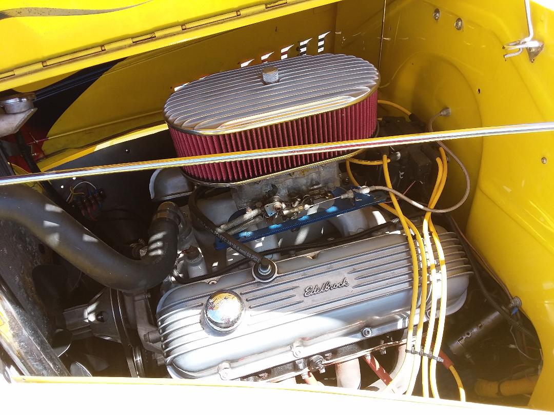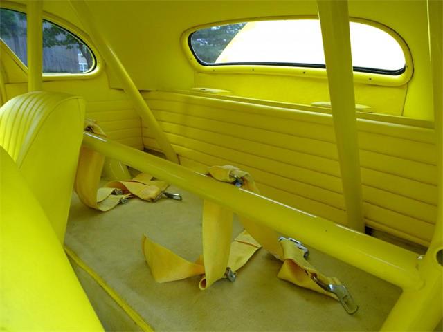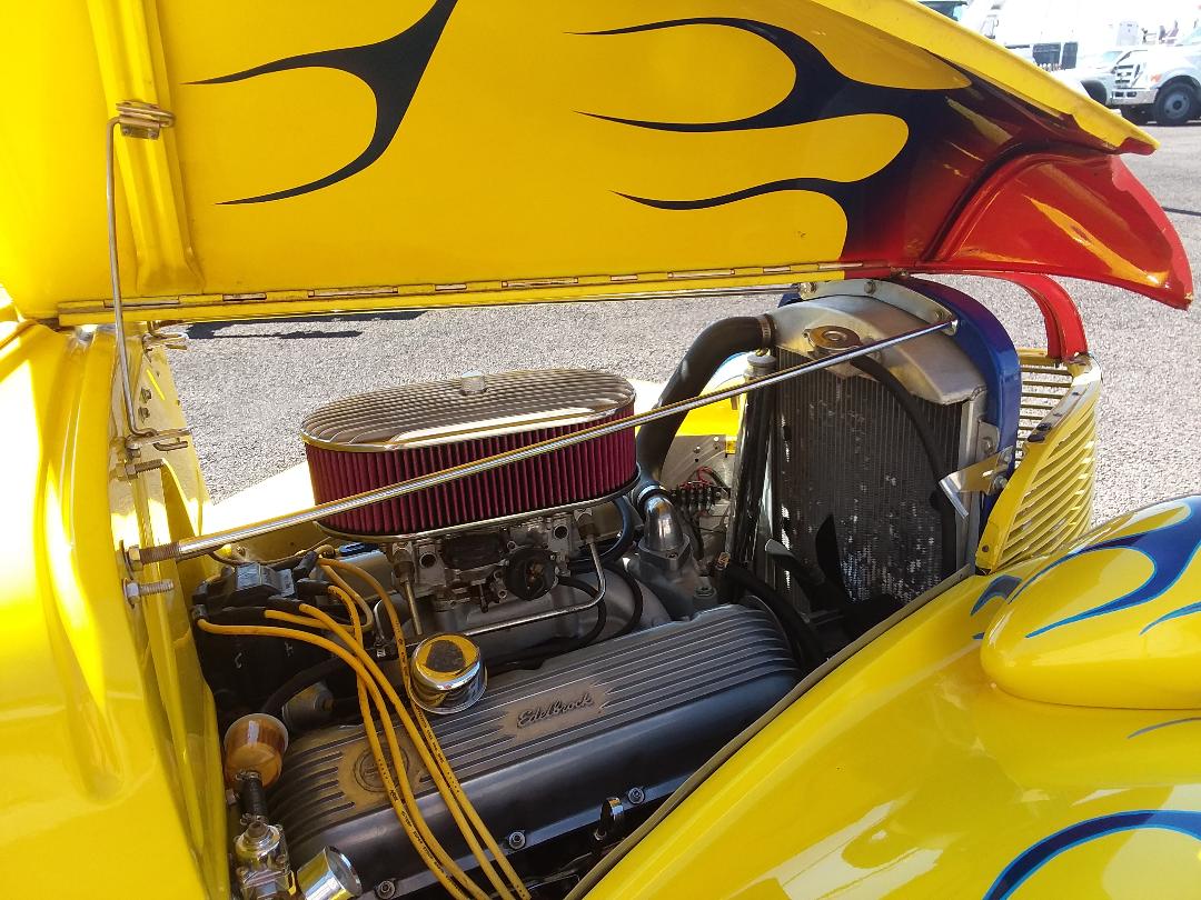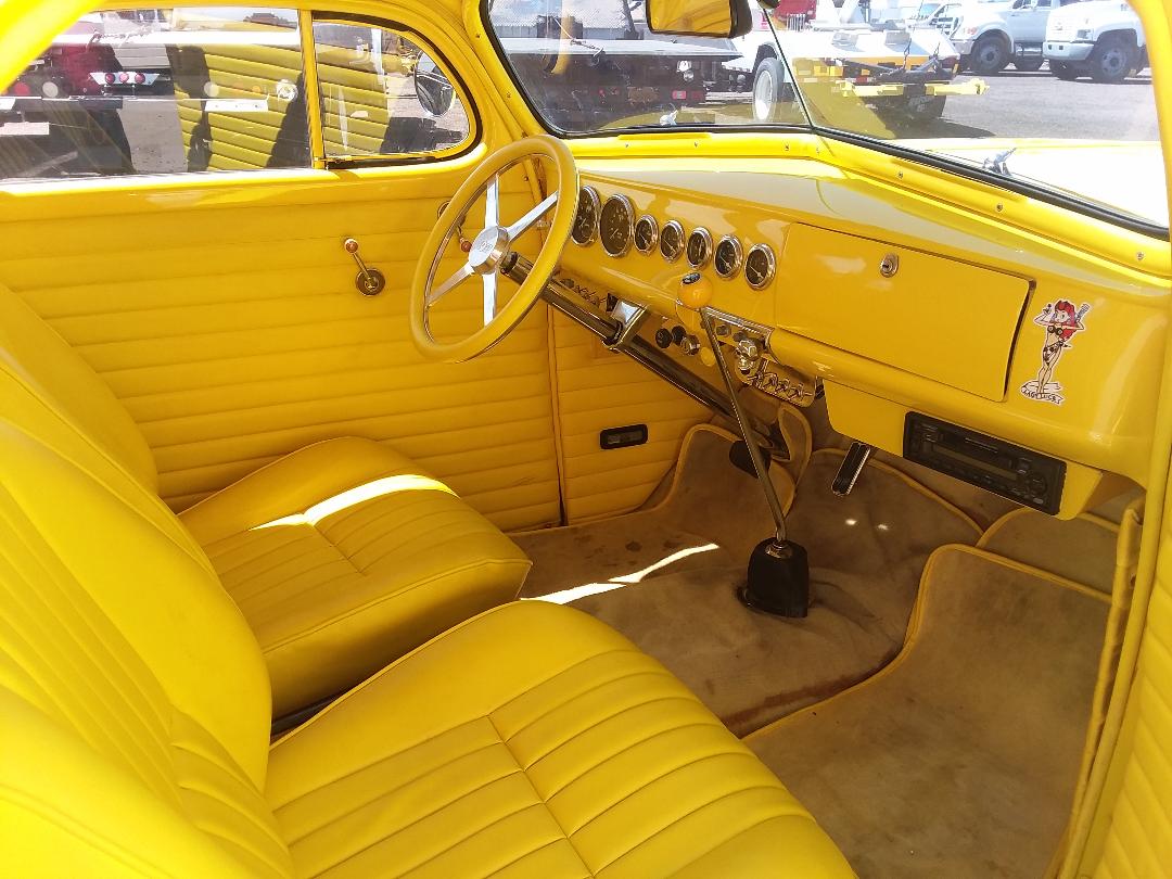 Boxed And Modified frame, tubed wheel wells, lightly modified Chevrolet 454 CID and Modified Turbo 400 auto transmission with shift kit, posi Ford 9″ rear end with 3:70 gears, Moser Engineering 31 spline forged steel axles, 3″ stainless steel exhaust with lake side caps, over sized Mickey Thompson Radial cheater slicks, full roll cage with racing harness safety belts, mechanical belt driven fan and switch controlled electric front fan, all steel body, sight chopped roof including side vent wing windows, multi metallic yellow paint with flames under clear coat ( even flames under hood ), shaved door and trunk handles and power door poppers. The nostalgic alloy wheels compliment the vintage hot rod appearance. The car is fully operational and street worthy. This is definitely a high quality build with great attention to detail.