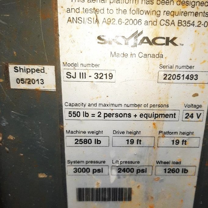 Year – 2013 . . . Make – SKYJACK . . . Model – SJ III 3219