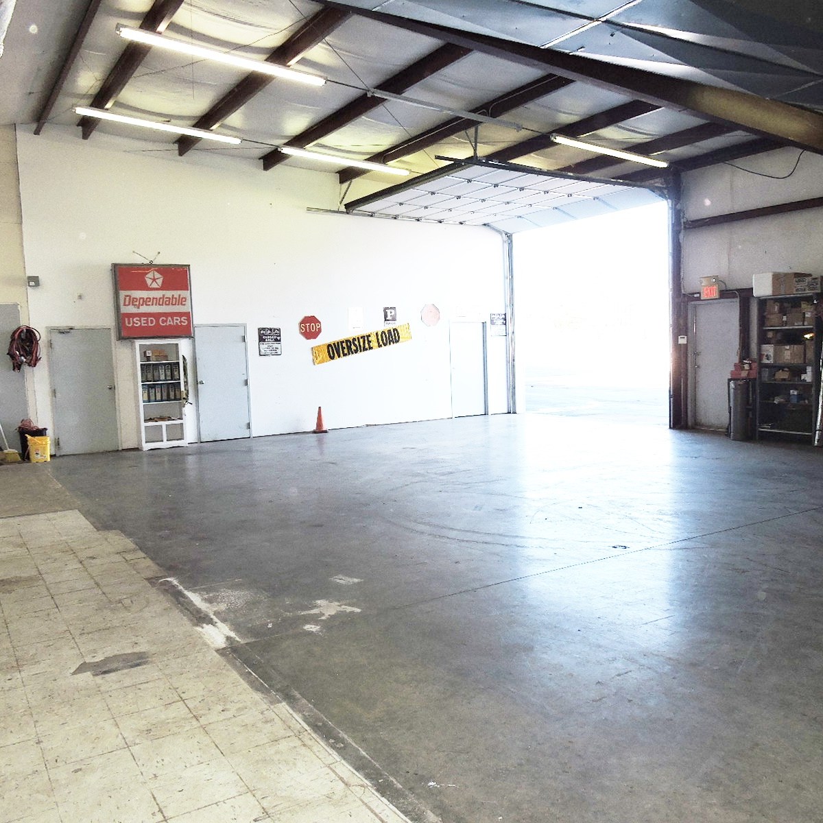 Additionally, the front portion also includes a shop-parts room area approximately 2,200 sq ft in size. This area features natural gas heating, large exhaust fan, fully insulated, 14 wide by 13 ft tall power roll up exterior wall insulated door, 9 ft wide by 7 ft tall interior wall roll up door for vehicle access to rear show floor, rear lockable sliding glass counter accessing rear building, tub sink and hose bib. This area also provides access to the large 2nd floor climate controlled mezzanine storage area as well as under stair storage and water main access.