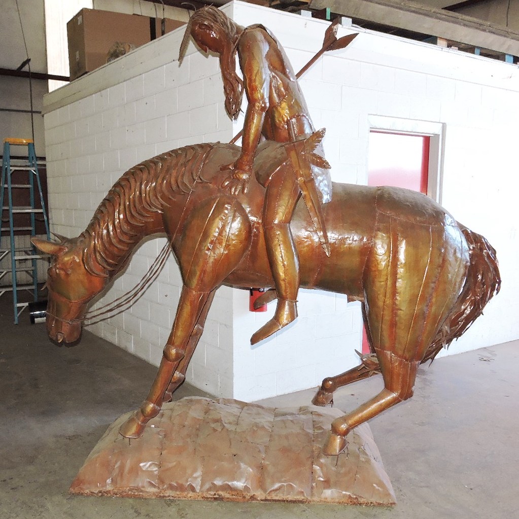 Replica Of Fredrick Remington’s TRAILS END, Very Nice Detail, Welded Steel Sheet Metal, Mounted On Full Base, Light Enough For 2 Men To Move, Measures 8 ft 10 inch Long — 8 ft 6 inch Tall — 3 ft 3 inch Wide