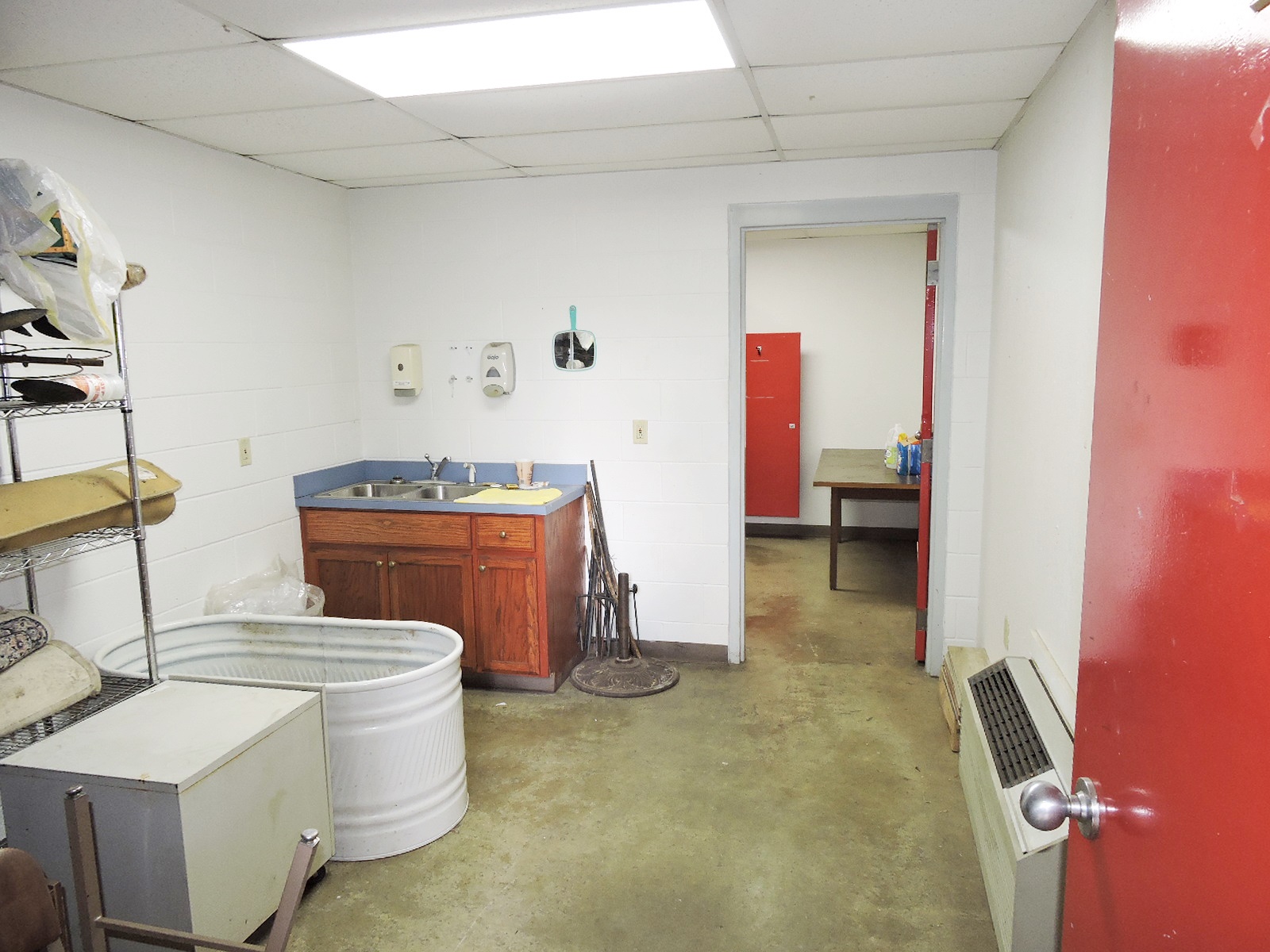 Additional internal improvements include a block construction area including lockable storage, employee break room with cabinet and sink, employee restroom, washing machine connection, tub sink and electric water heater. A separate manager office and customer counter is located behind a safety railing.